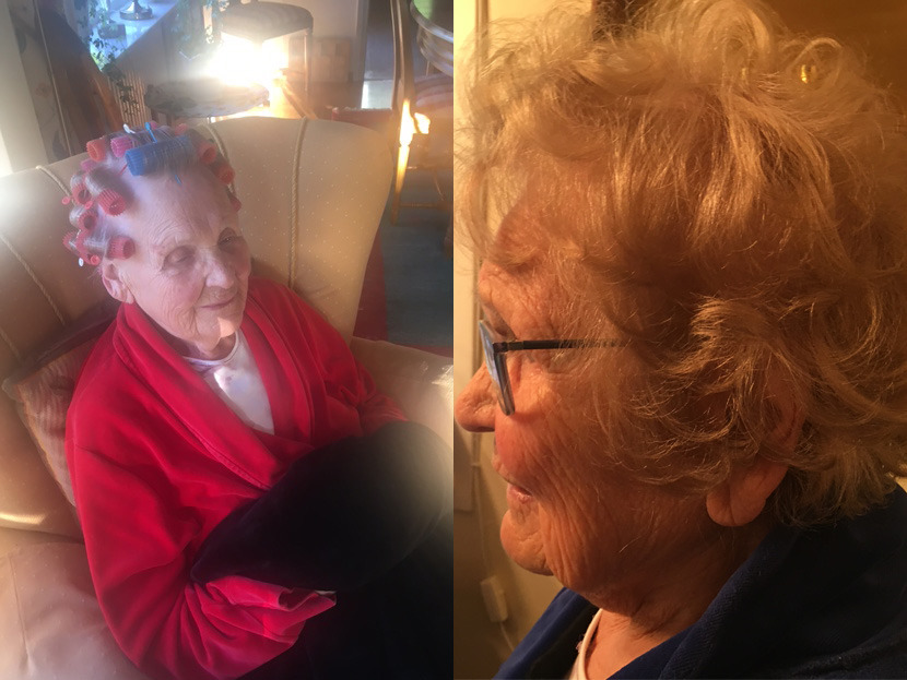 Nancy sköter sin hygien själv men nu har hon fått en skön dusch av Annika som också tvättat och lagt håret. "Jag känner att du rullar rätt" säger hon till Annika. Håret är viktigt för Nancy som arbetat i många år på sin dotters frisersalong på Östermalm. Nancy doftar alltid gott från topp till tå och vi kallar henne för vår nyponros. Då skrattar hon och blir friskt röd om kinderna!