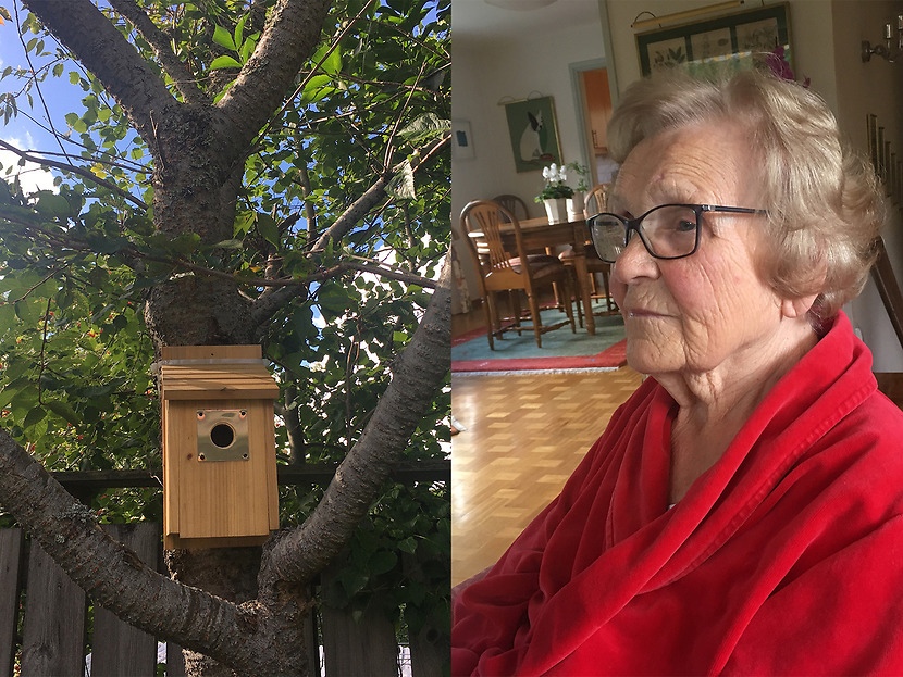 För tre år sedan flyttade Nancy hem till en av sina döttrar med man till stor glädje för alla. Hemmet andas av kärlek och energi och här finns det även kraft till att ordna ett fint boende för småfåglarna. På bilden syns en av fågelholkarna i den jättevackra trädgården.